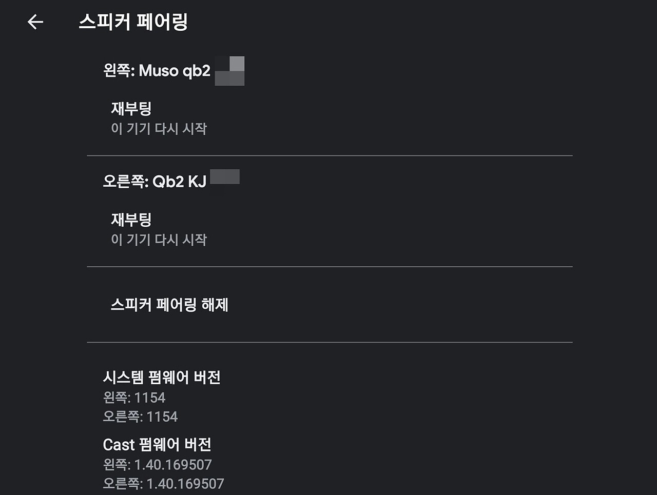 스피커 페어링? 뭐지 하고 보다 보니 구글 스피커끼리 스테레오 구성할 때 쓰는 메뉴였는데.. QB2 2대가 있으니 활성화가 된 것 같았다.