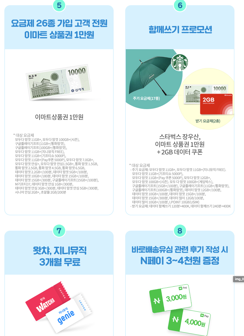 또한 지금 7월 31일까지 여러 가지 이벤트로 초기 유심 6600원 결재만 하면 이후 유심비 지원에 이마트 상품권부터 편의점 상품권 등등 이래도 유지가 되나 싶을 정도의 엄청난 혜택이 있으니 다른 분들도 꼭 비교해보고 훌륭한 가성비를 가진 케이티엠 모바일을 추천해본다.