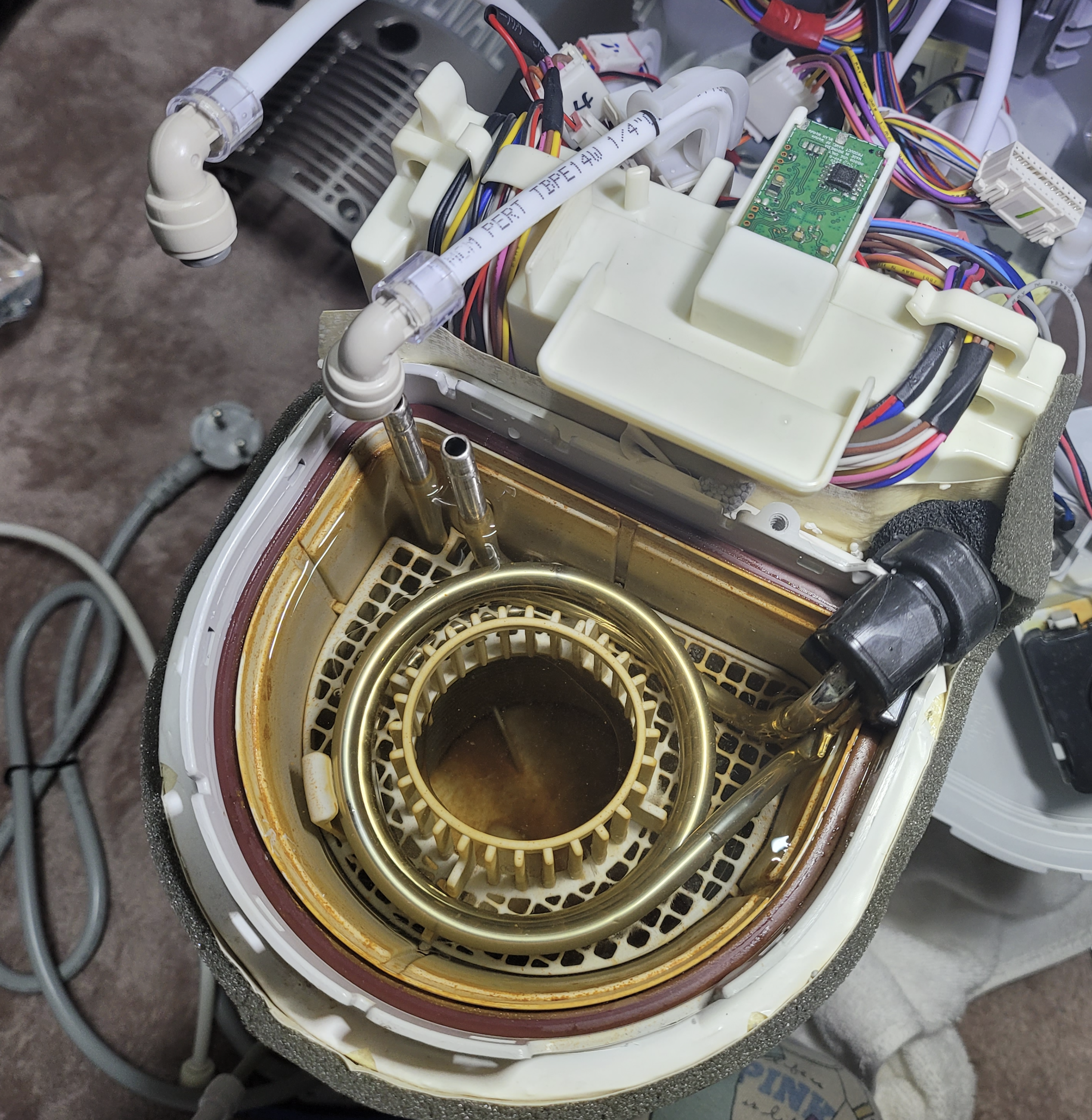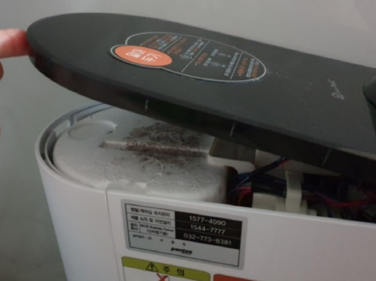 아무튼 제목처럼, 뚜껑에 온도센서가 붙어있는데, 냉각수가 부족하면 계속해서 컴프가 돌아버리는데, 그렇게 되면 냉각수 통 전체가 얼어붙어서 나중에는 관 안에 물까지 얼어버리면서 정수기 물이 나오지 않는다.