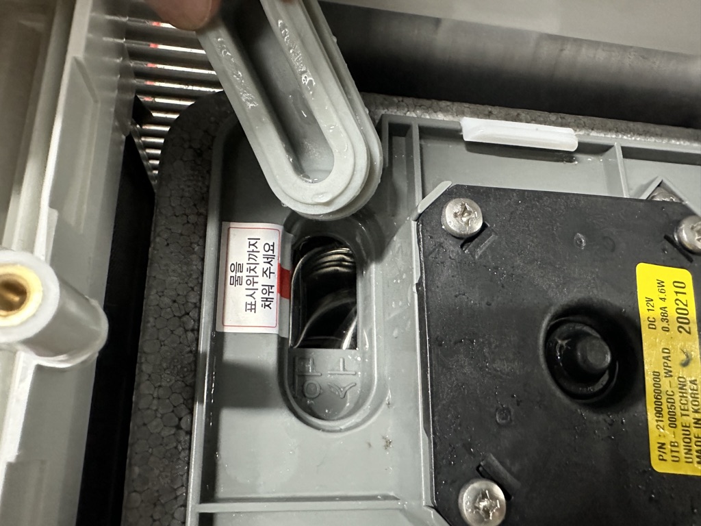 (실리콘 뚜껑을 제거하면 물이 나오는 걸 알 수 있는데 이건 냉각수통의 결로가 밑으로 고여있는 것으로 냉각수 통의 물이 새는 것은 아니기 때문에 걱정하지 않아도 된다. 결국 SK매직도 엘지보단 조금 낫긴 하지만 결로 현상을 제대로 케어해주지는 못하고 있다.)