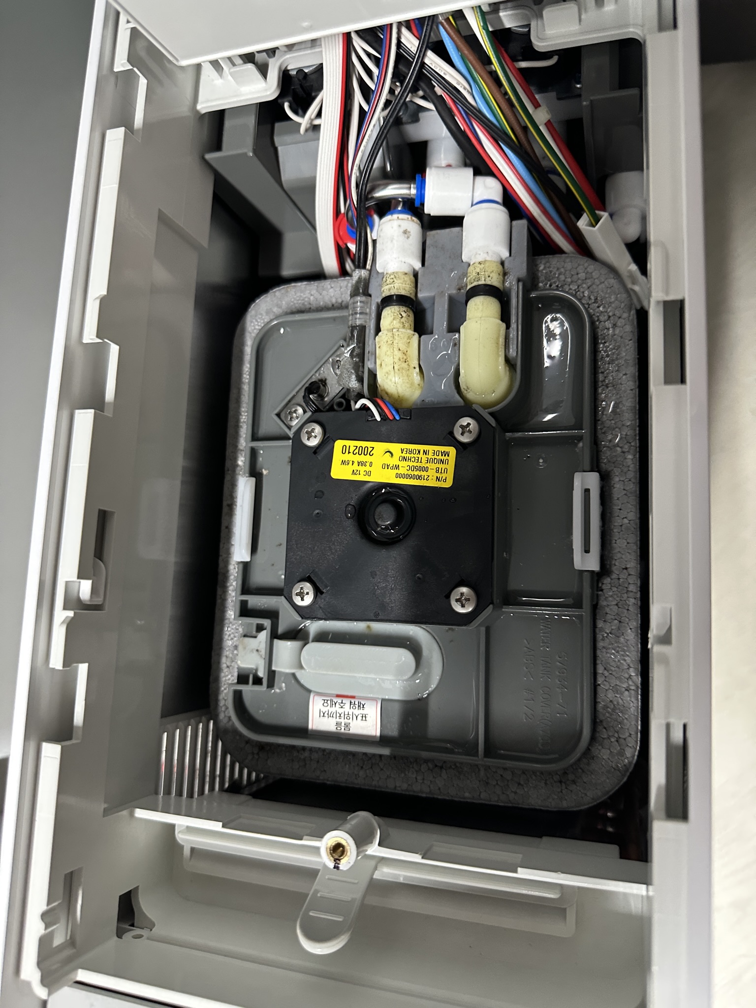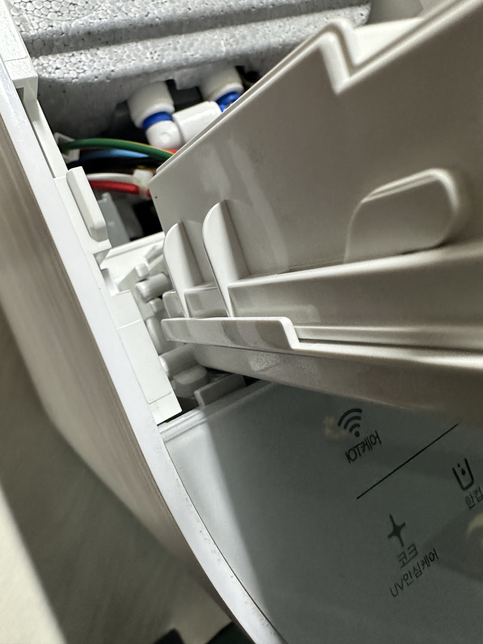 정면을 기준으로 오른쪽에 보이는 뚜껑을 제거하면 아래와 같은 모습을 볼 수 있다. 정수기 호스 리무버를 이용해서 뽑아낸 뒤에 정품 필터나 호환필터로 교체해 주면 되는데, 그전에 필터를 10~15분씩 미리 출수작업을 해준 뒤 작업을 해줄 필요가 있다. 이 작업을 건너뛰고 그냥 필터를 교체할 경우 쓴맛, 신맛, 휘발유 맛 같은 이상한 맛이 난다. 절대 그냥 교체하면 안 되고 기존 필터 제거 전에 조리 수 호스를 사용해서 충분히 출수한 뒤 교체해 준다. 교체한 후에 연결 부에서 물이 떨어지는 부분이 없는지 확인해줘야 하며 한 방울이라도 떨어지면 문제가 되니 제대로 확인 후 문제가 있을 시 제거 후 다시 연결하거나 ㄱ 연결부 부품을 새로 구해서 연결해준다.