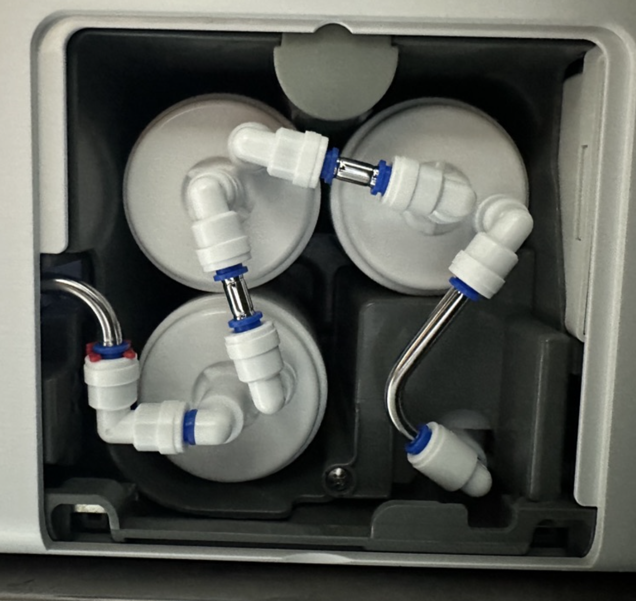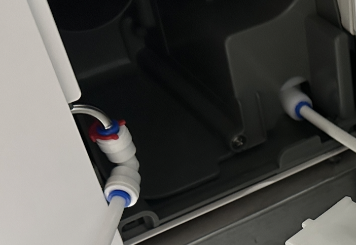 외부 필터를 연결하기 위해 정수기 자체의 호스를 직렬로 연결하기 원할 경우는 아래 사진과 같이 보이는 양쪽 구멍을 서로 정수기호스 하나로 연결해 준다. 사진은 호스가 밖으로 나가있지만 안쪽으로 들어갈 수 있게끔 재단하여 사용하면 된다.
