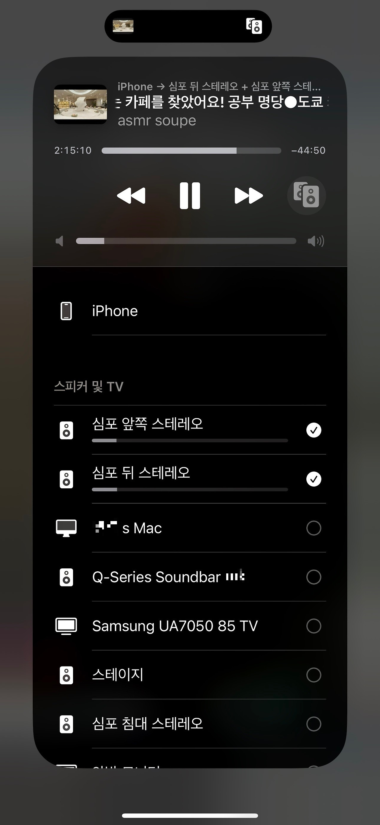 2. 재생 대상에 2번 스피커 혹은 그룹 추가 / 여기 까지만 해도 문제없이 에어플레이 그룹 연결이 됩니다. 이후 유튜브 재생등 하면 됩니다.