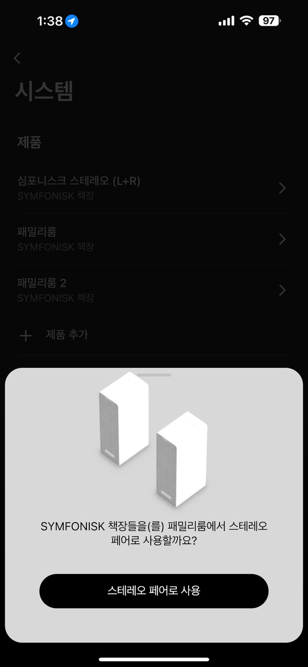 최초 연결시 전원 인가 후 근처에서 어플을 켜면 에어팟처럼 팝업이 뜨면서 진행이 되며 최초 1대만 와이파이 암호를 물어보고 2대째부터는 와이파이 암호도 입력할 필요 없이 최초 연결된 스피커에서 알아서 정보를 받아오니 편리하며, 2대째부터는 알아서 스테레오로 구성할 것인지 물어봅니다.