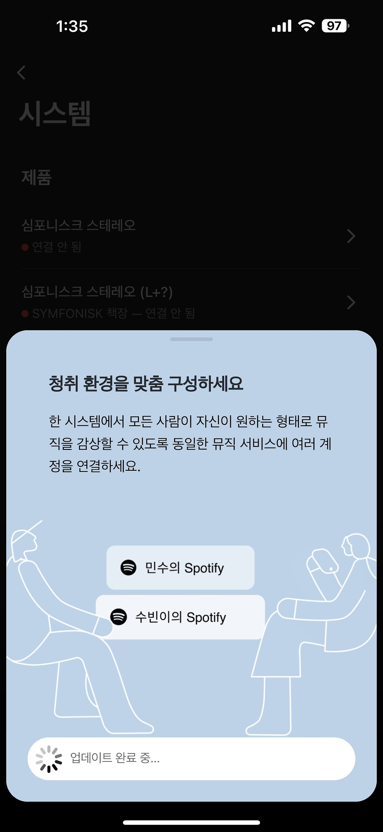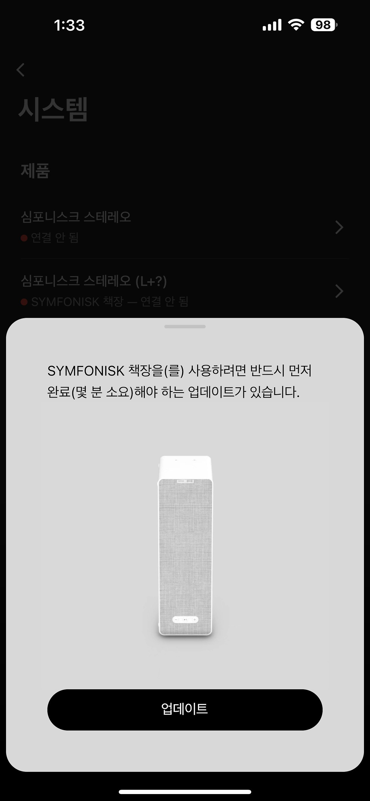 처음 앱을 설치하고 스피커에 전원을 넣으면 아래와 같은 화면을 보실 수 있고, 업데이트 및 스테레오 페어링 까지 쉽게 진행이됩니다.